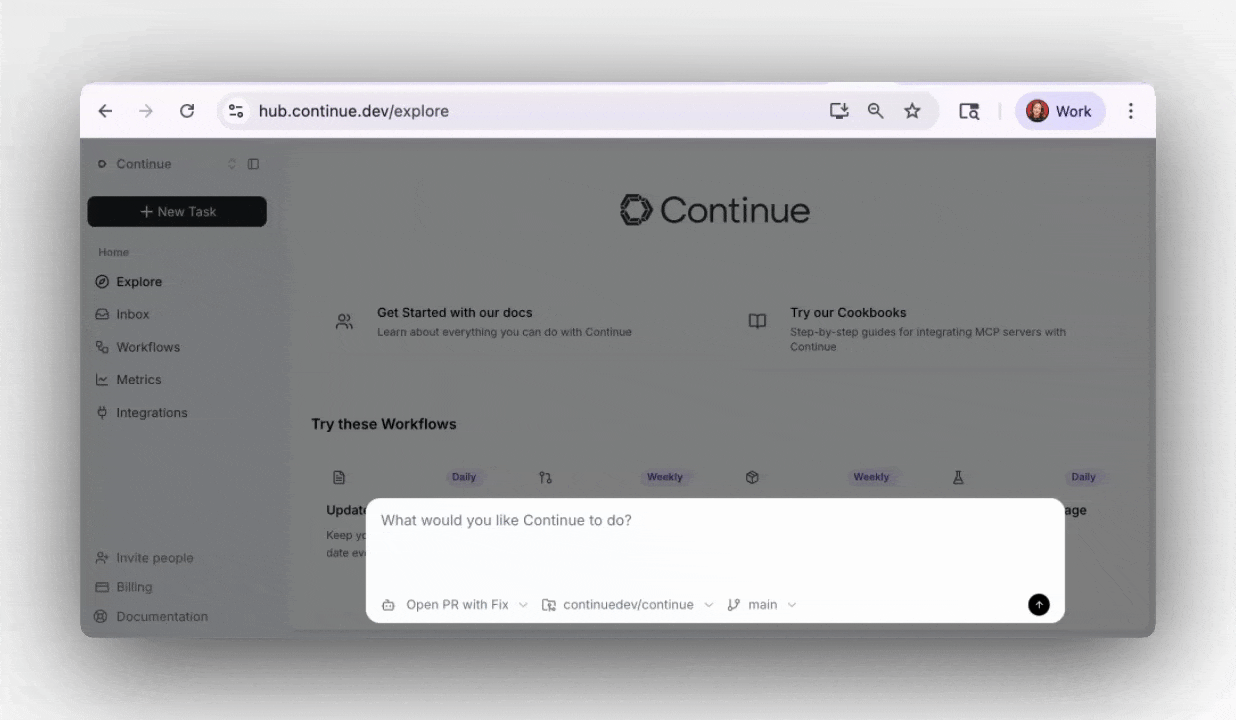 Continue cloud agents are your task executors, AI that can take structured action on your trigger through Tasks, Integrations, and Workflows, and do it consistently across an entire team.