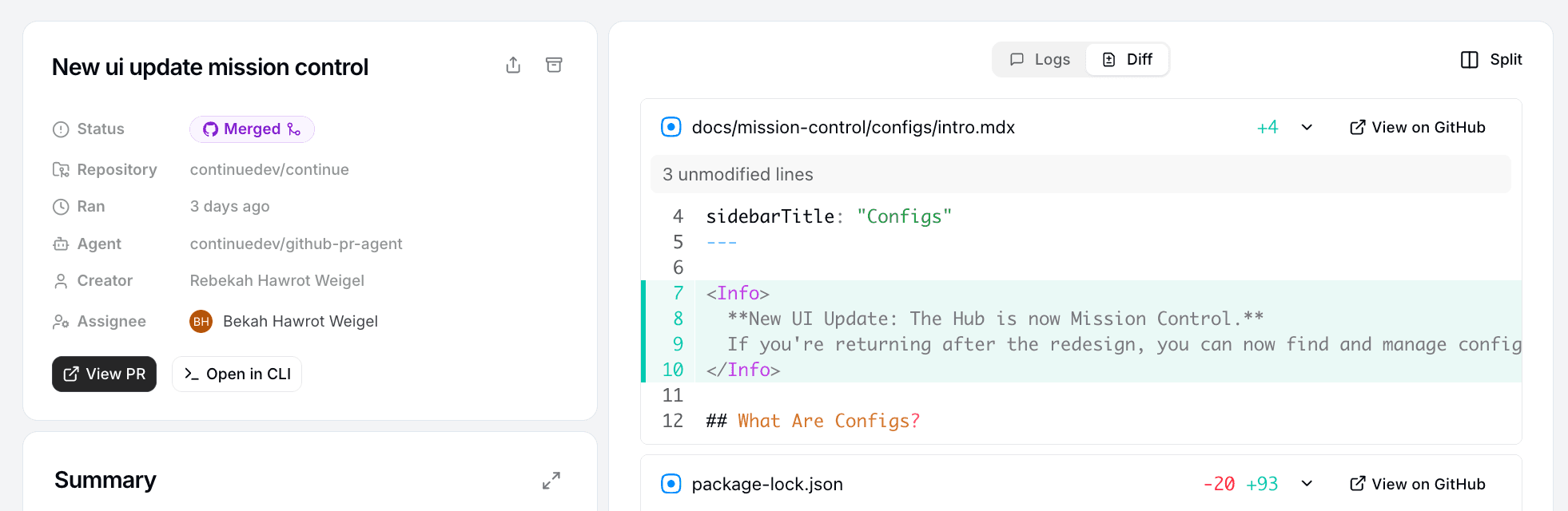 My Agent located the file, made the update, and showed me the diff.