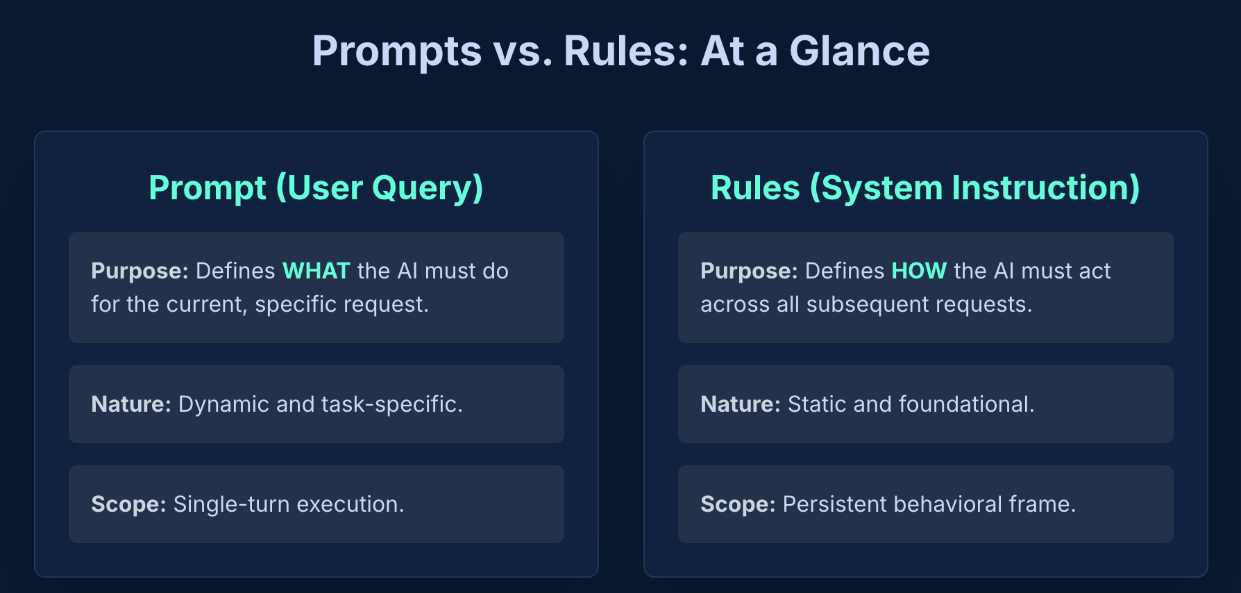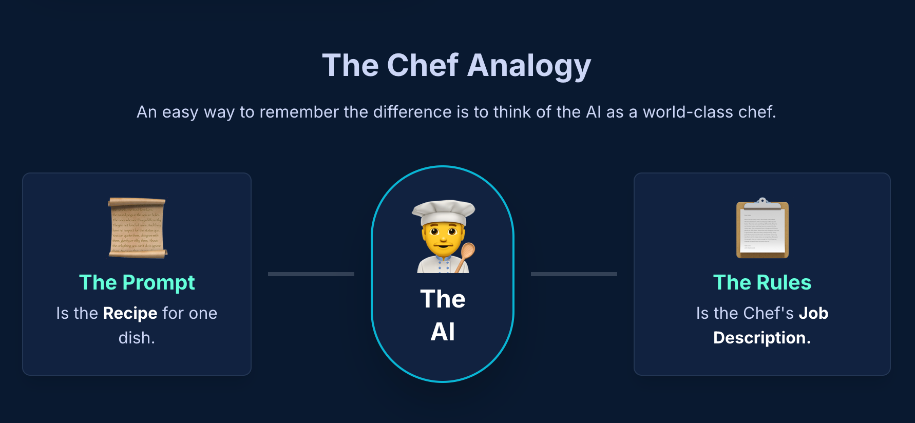 Think of the analogy of AI as a world-class chef: prompts are the recipe for a single dish, while rules are the chef’s job description.