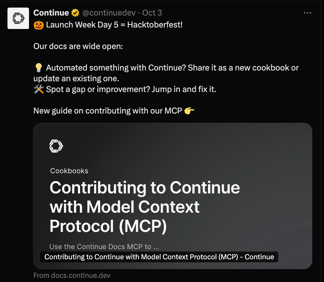 This year our team opted in to Hacktoberfest with the goal of helping new contributors make documentation contributions. In an effort to make the experience as frictionless as possible, I created an AI agent that included our MCP, Mintlify rules, and Mintlify docs and we created a cookbook to contributing with our MCP.