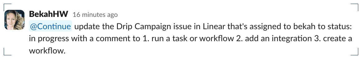 This is a simple example, but it’s foundational. You can update status, assign owners, changing priority, link issues, directly from Slack. Slack becomes the interface. Linear becomes programmable. The agent handles the glue. If you want to take it a step further, you can call @Continue in the Linear issue and ask it to draft a PR as well.