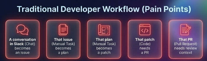 The back-and-forth happens in Slack, but the actual work lives in GitHub. There's friction in that handoff, and friction means things slip through the cracks.