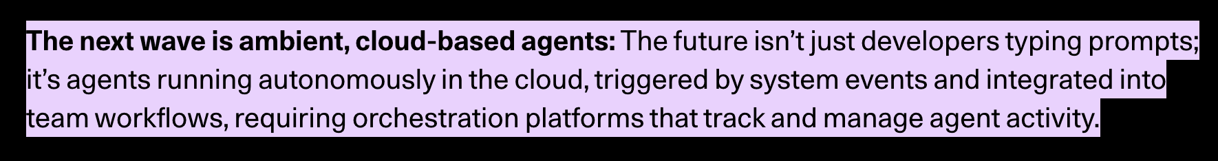 Unlike local or IDE-based agents, cloud agents can operate continuously and reactively, even long after a PR has merged. They're most useful for repetitive work, when they aren't tied to a single coding session, when it affects a team. (You can learn more about them in our Cloud Agents Taxonomy Guide.)