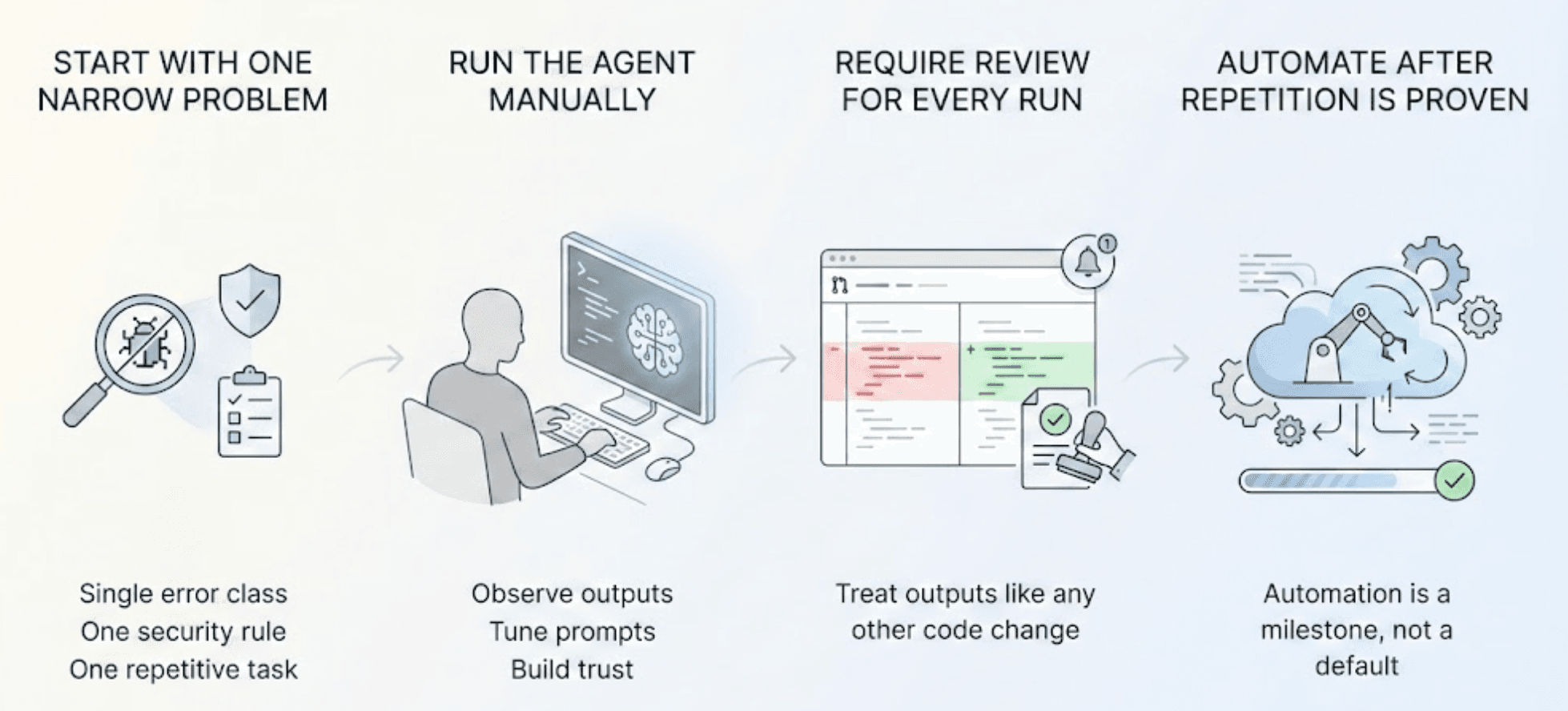 - Start with one narrow problem: A single error class. One security rule. One repetitive task.